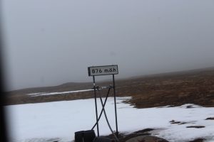 Le ciel est couvert et il pleut, aujourd’hui une étape plus longue nous emmènent en Norvège à travers de grands espaces sauvages, nous avançons sous la pluie et les montagnes sont cachées par les nuages, dommage, il manque un peu de soleil.
