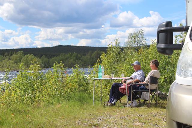 Nuit très calme, le soleil est toujours présent malgré quelques petits nuages, après renseignement sur l’état de la route « Vildmarksvägen » (une route touristique qui s’étend du nord du Jämtland au sud de la Laponie) en fin de matinée nous continuons notre route vers la Laponie suédoise. Notre route n’est faite que de forêts, lacs et torrents.ue nous explorons à pied.