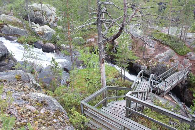 Après le soleil matinal, les nuages arrivent, nous continuons notre route vers Kiruna avec un arrêt aux chutes du Harsprangsfallen, chemin avec de nombreux petits dénivelés et passages de cours d’eau sur des passerelles qui offre une vue magnifique sur le canyon.